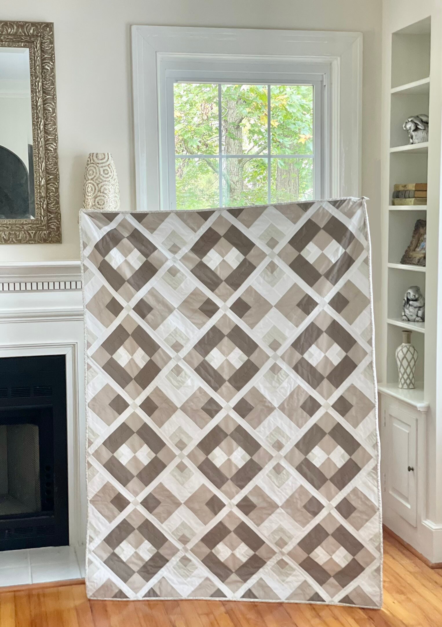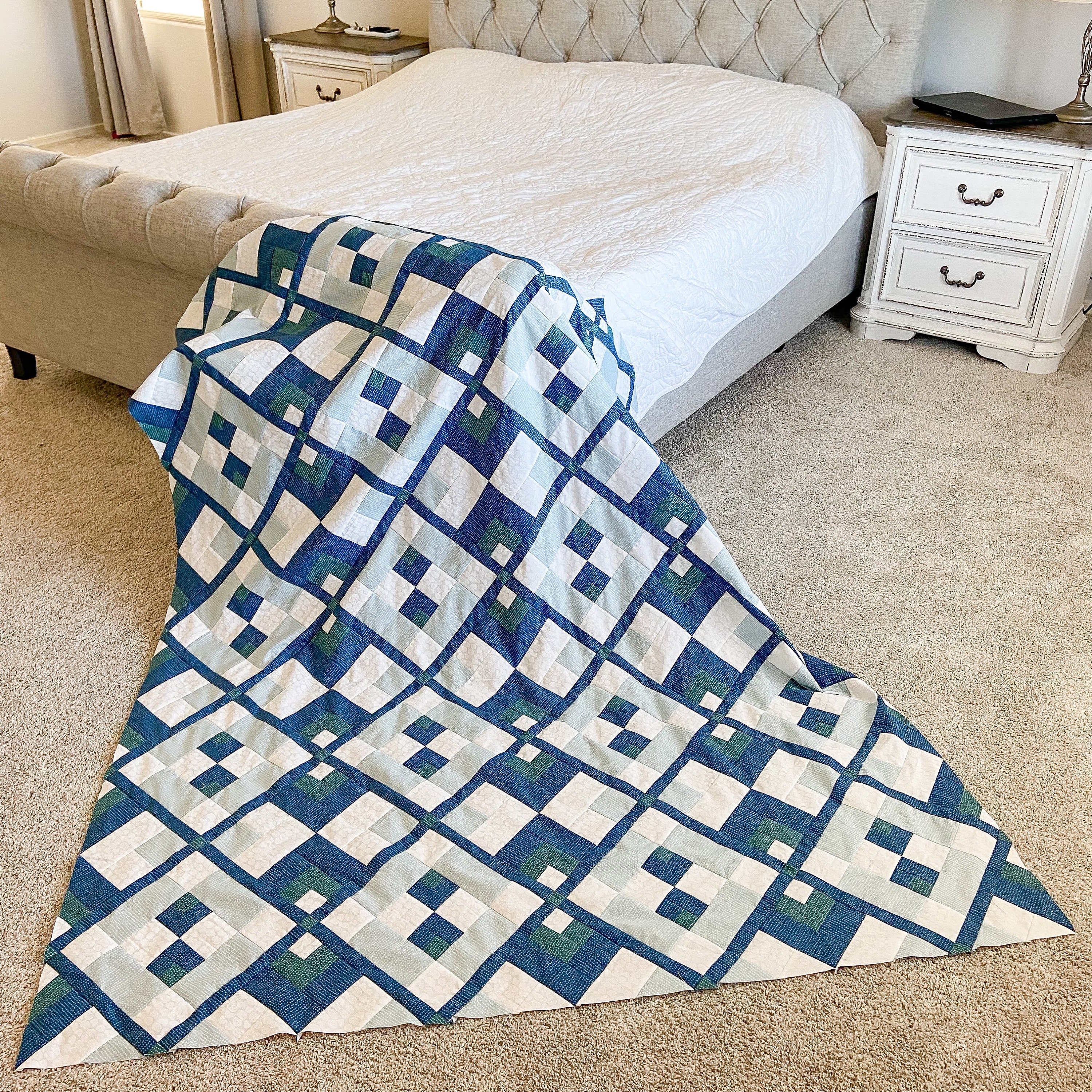 The Chateau Quilt is based on a complimentary pair of log cabin blocks with a modern skinny sashing complete with contrasting cornerstones. This pattern is perfect for the intermediate quilter, as a consistent 1/4" seam is critical. Finished block size is 10".