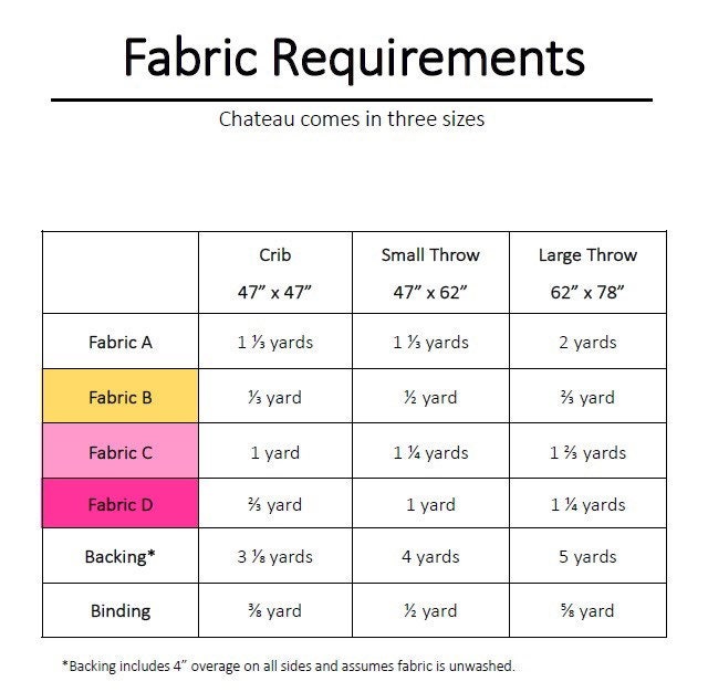 Chateau offers three sizes (crib, small throw, and large throw) and is written to for yardage. The cover quilt shown is the large throw size.