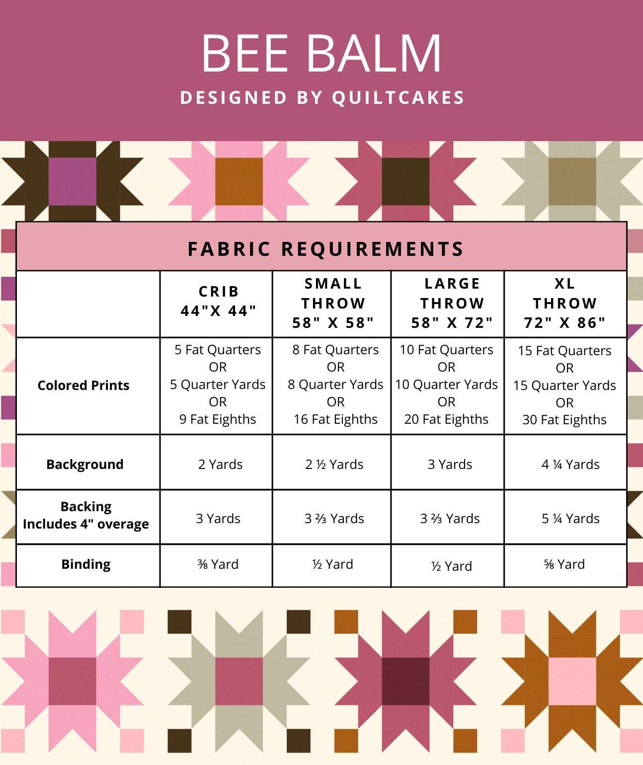 Bee balm offers four sizes (crib, small, large and extra large throw) and is written for fat quarters, fat eighths, and quarter yards. The cover quilt shown is the large throw size made with fat quarters.