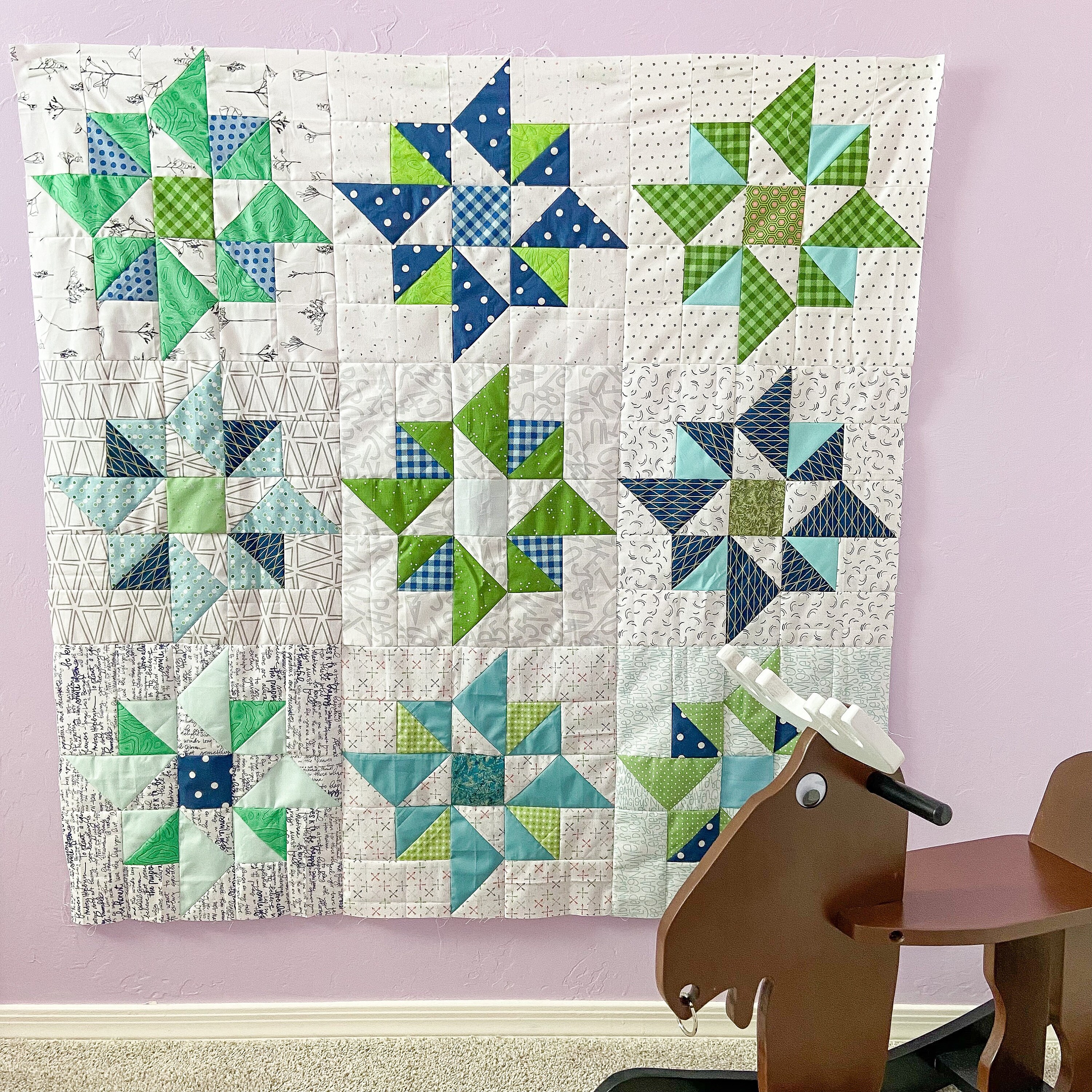 Topsail offers three sizes (crib, small, and large throw) and is written for fat quarters and yardage. Blocks finish at a generous 15". The cover quilt shown is the large throw size made with fat quarters.