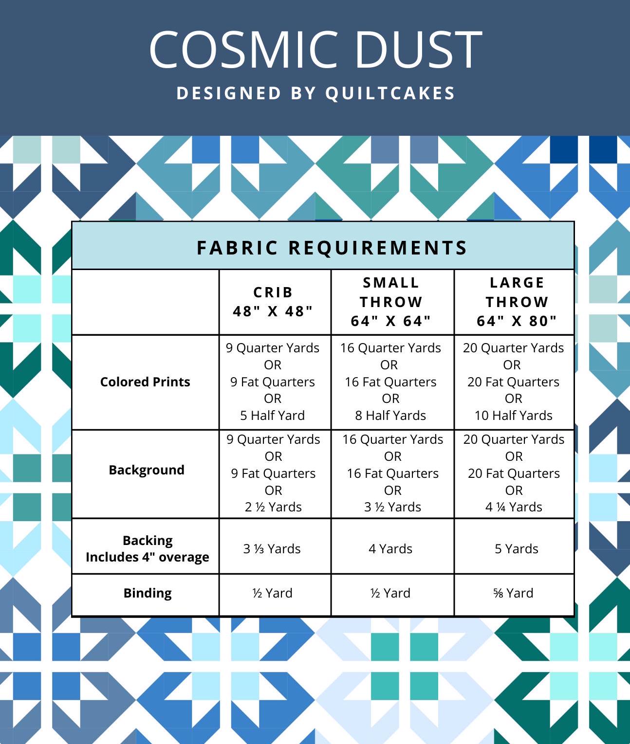 Cosmic Dust offers three sizes (crib, small, and large throw). Blocks finish at a generous 16". The cover quilt shown is the large throw size made with fat quarters.