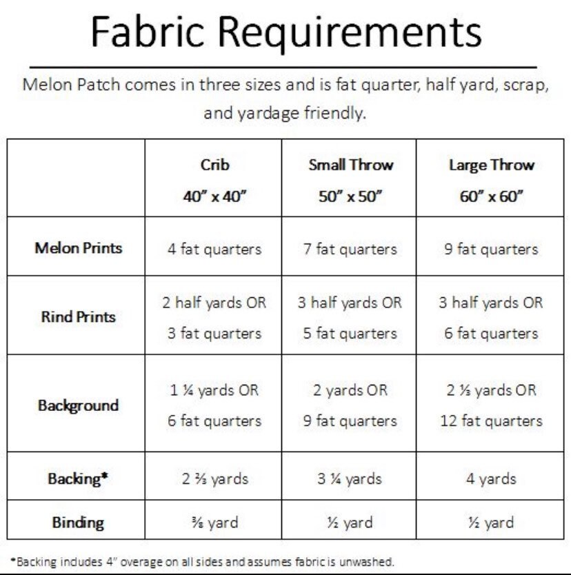 Melon Patch offers three sizes (crib, small, and large throw). Blocks finish at a generous 10". The cover quilt shown is the large throw size made with fat quarters and half yards.