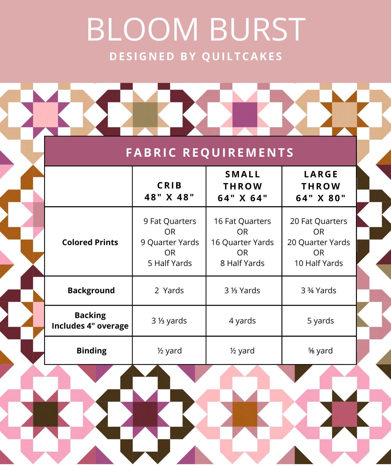 Bloom Burst offers three sizes (crib, small, and large throw). Blocks finish at a generous 16". The cover quilt shown is the small throw size made with fat quarters.