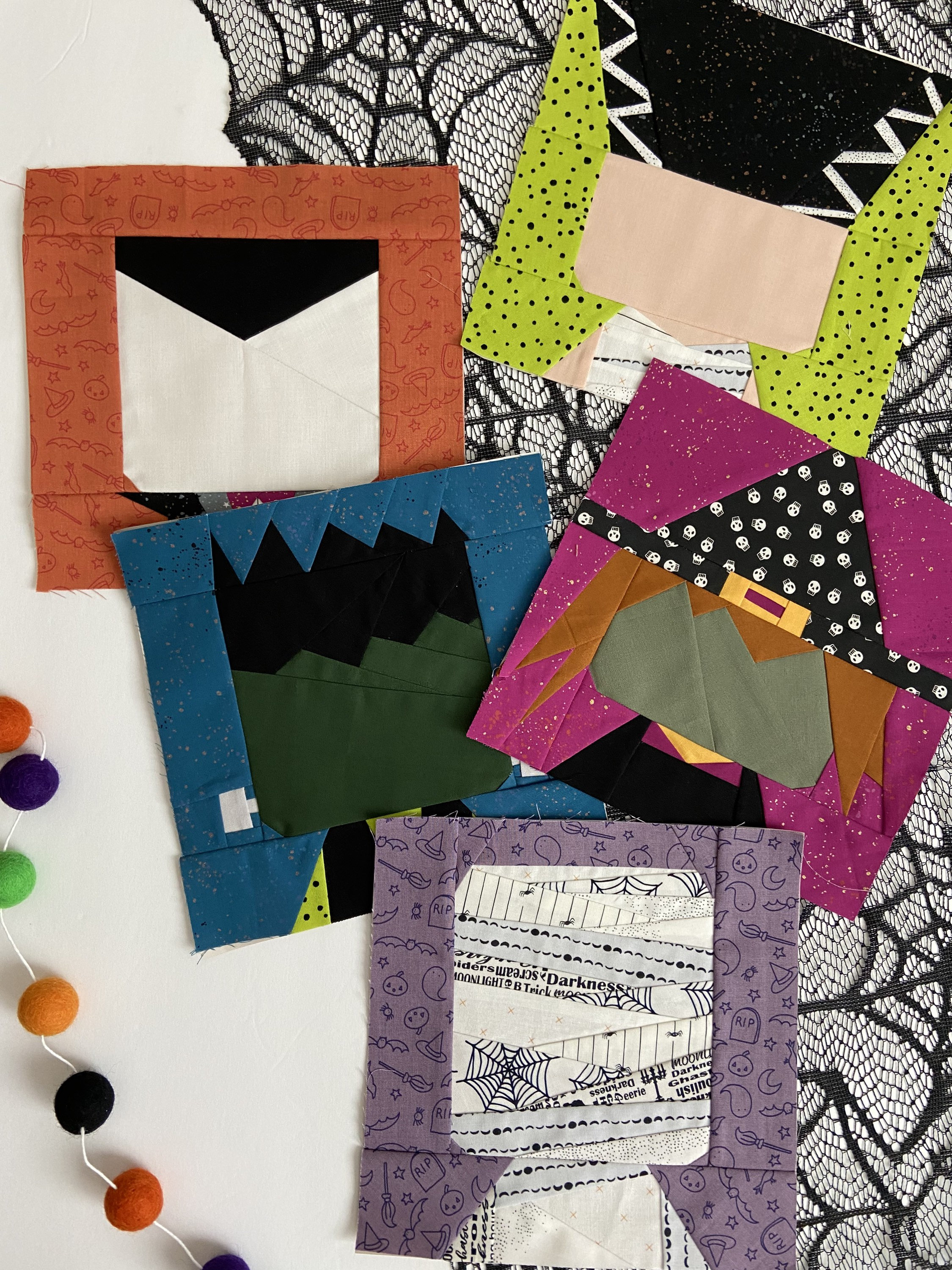This pattern is for all 5 Halloween themed 12" x 12" quilt blocks.