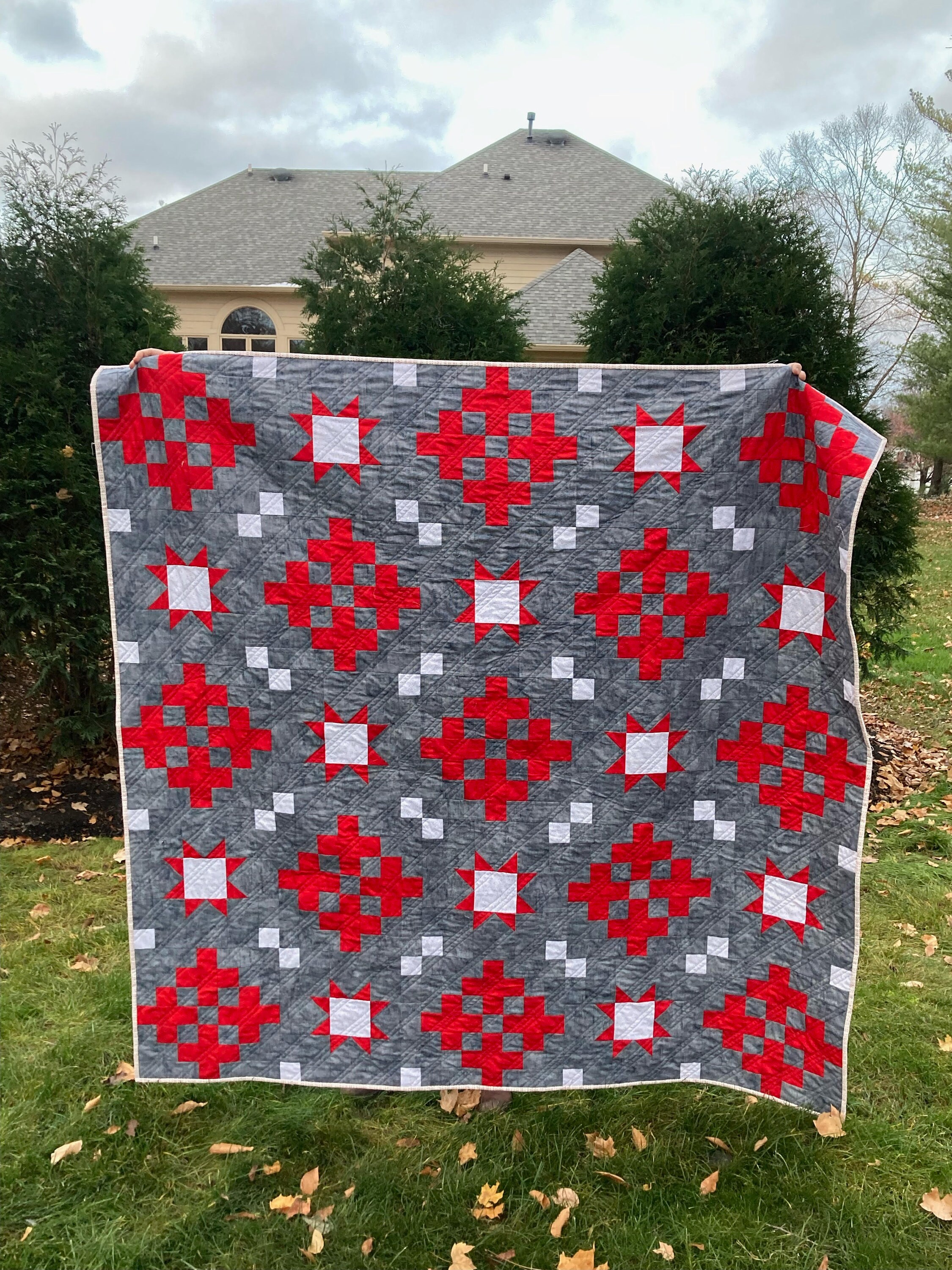The Bailey Quilt offers four sizes (crib, small, large, and extra large throw) in two different color ways. Blocks finish at a generous 14". The cover quilt shown is the large throw size in a traditional colorway.