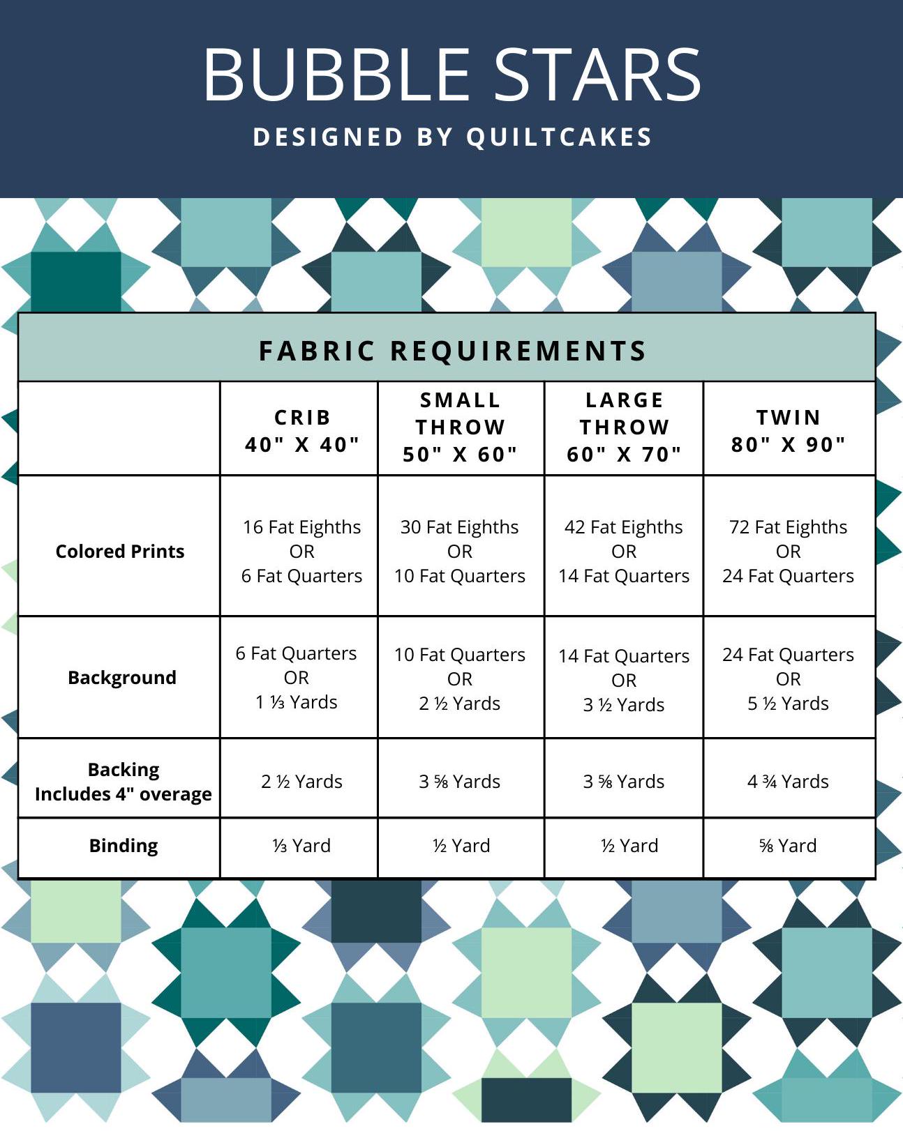 The Bubble Stars Quilt offers four sizes each (crib, small throw, large throw, and twin) that can be made with fat eighths, fat quarters or yardage. Blocks finish at 10".