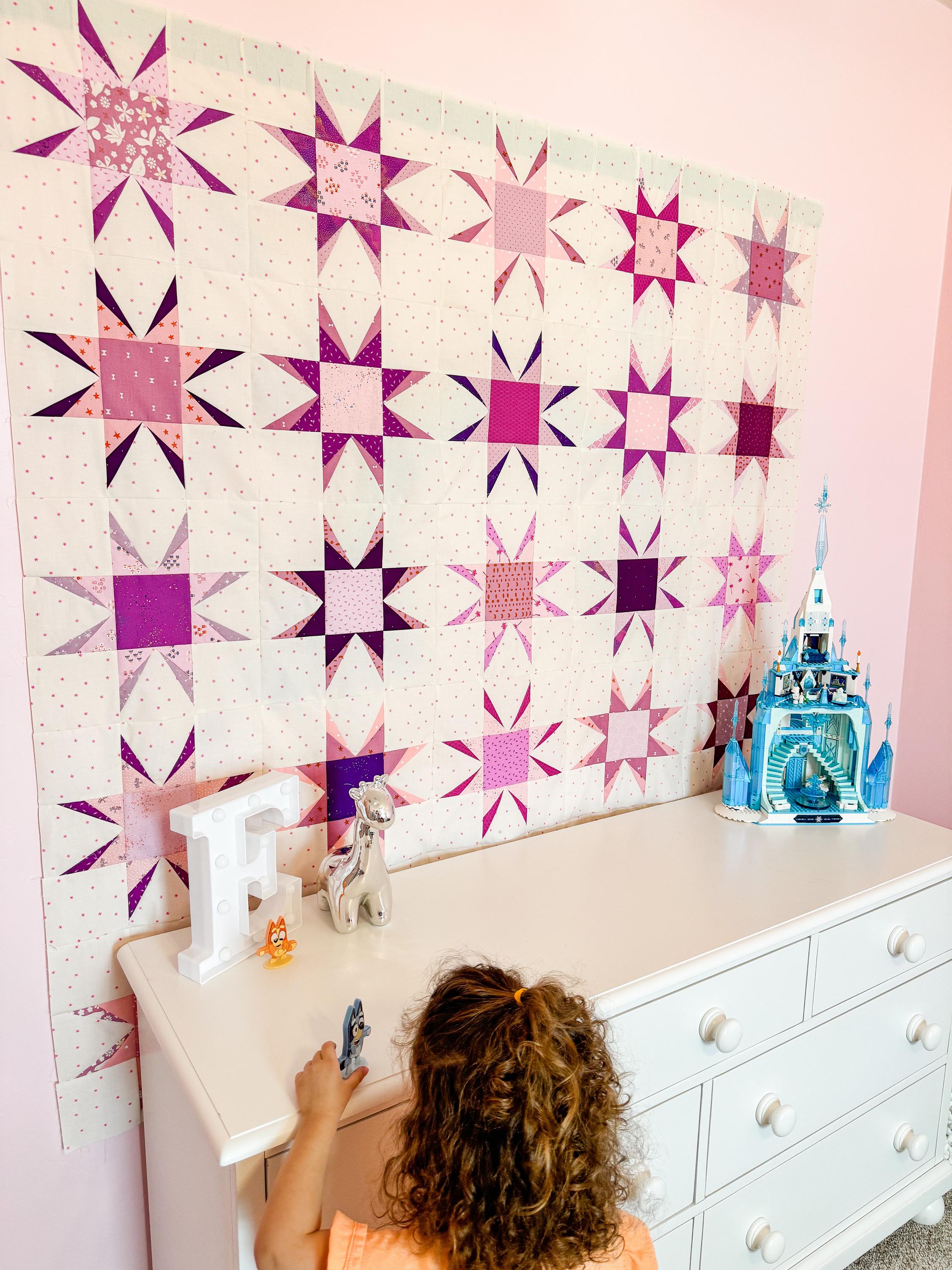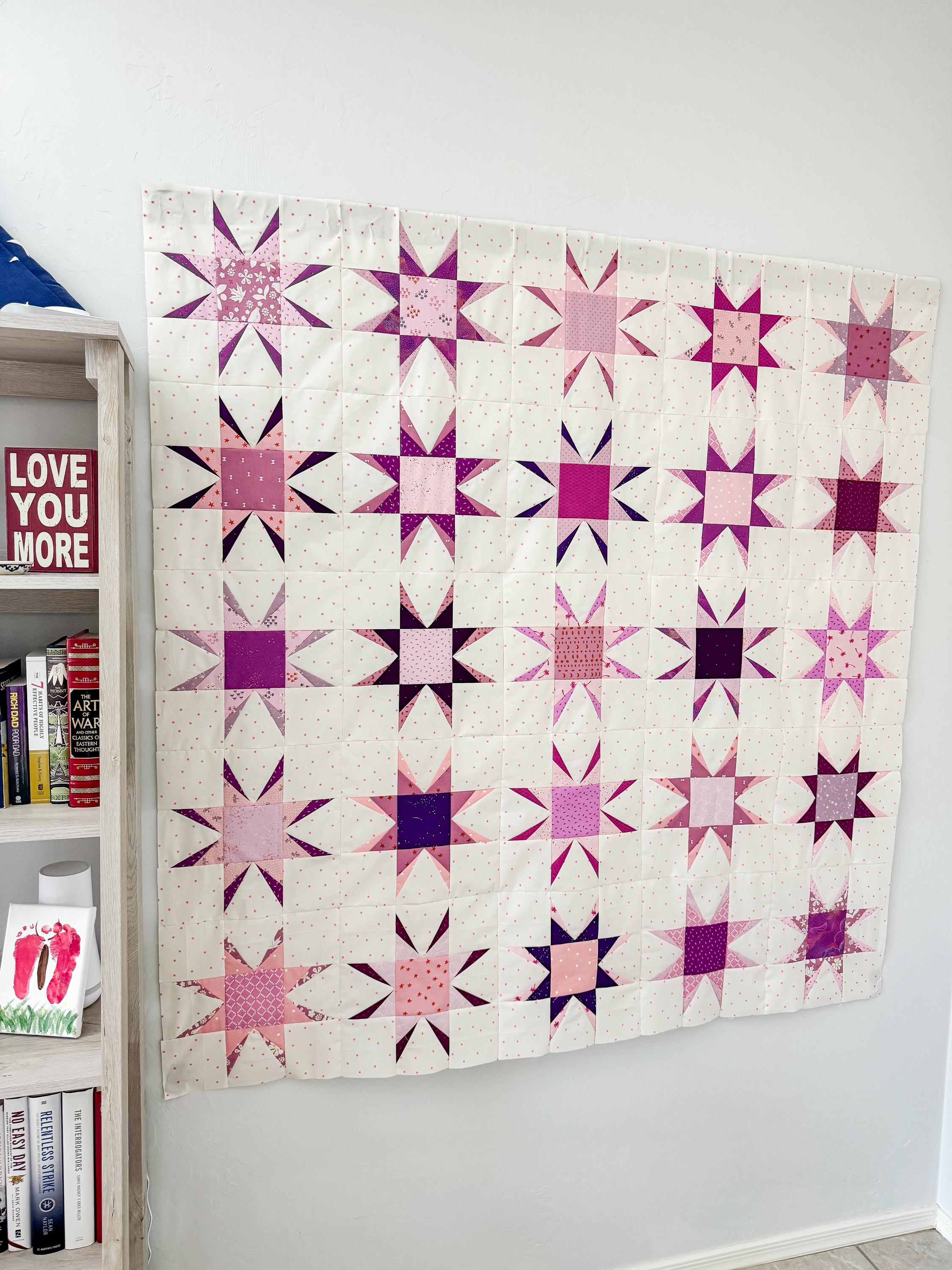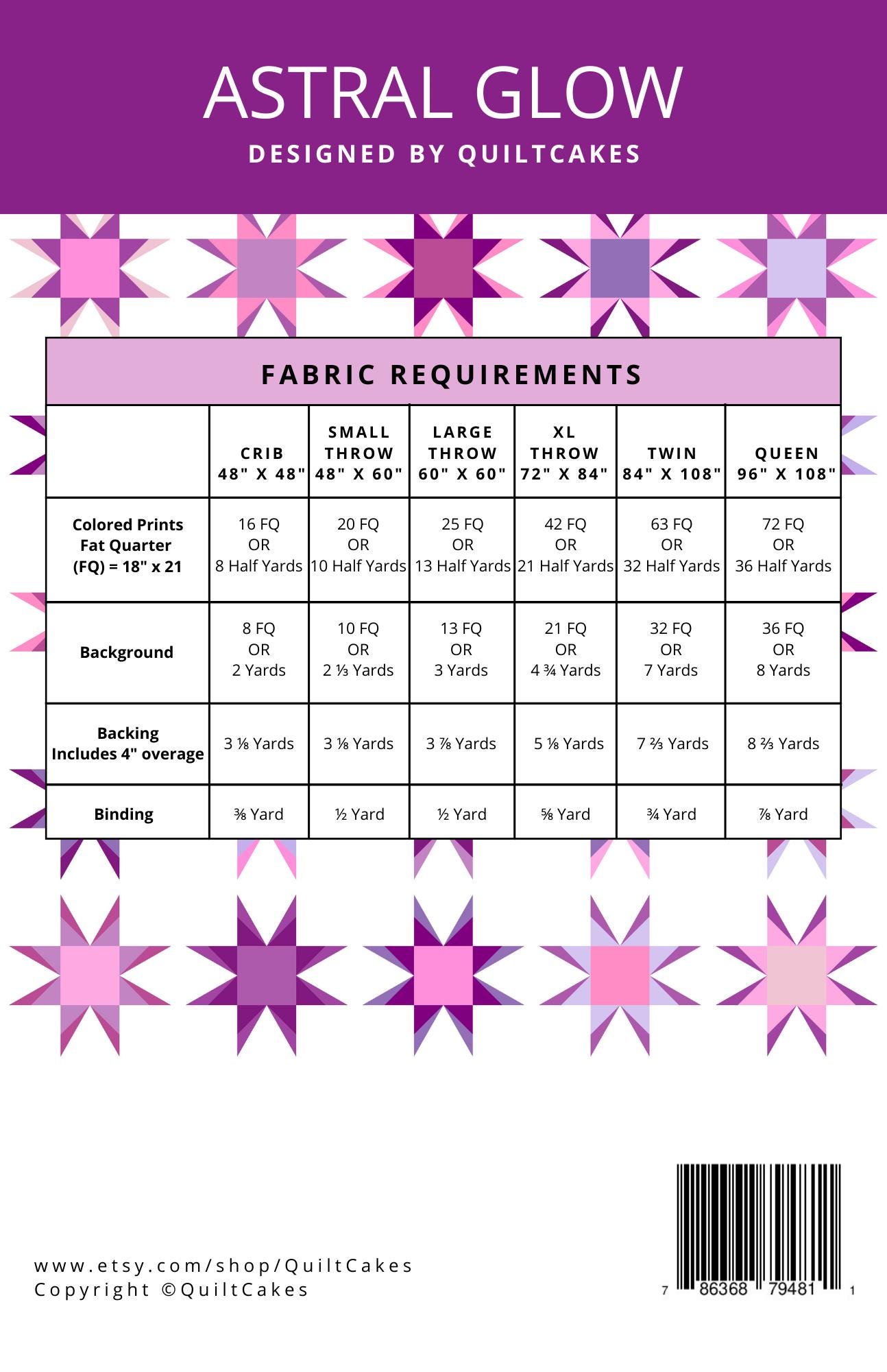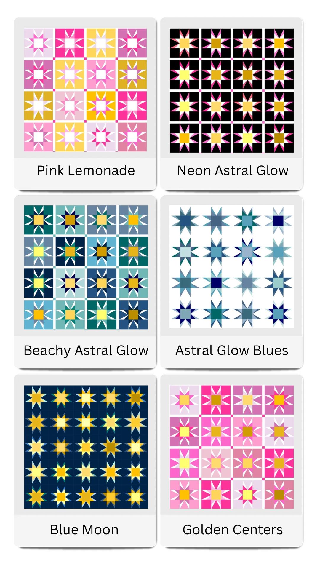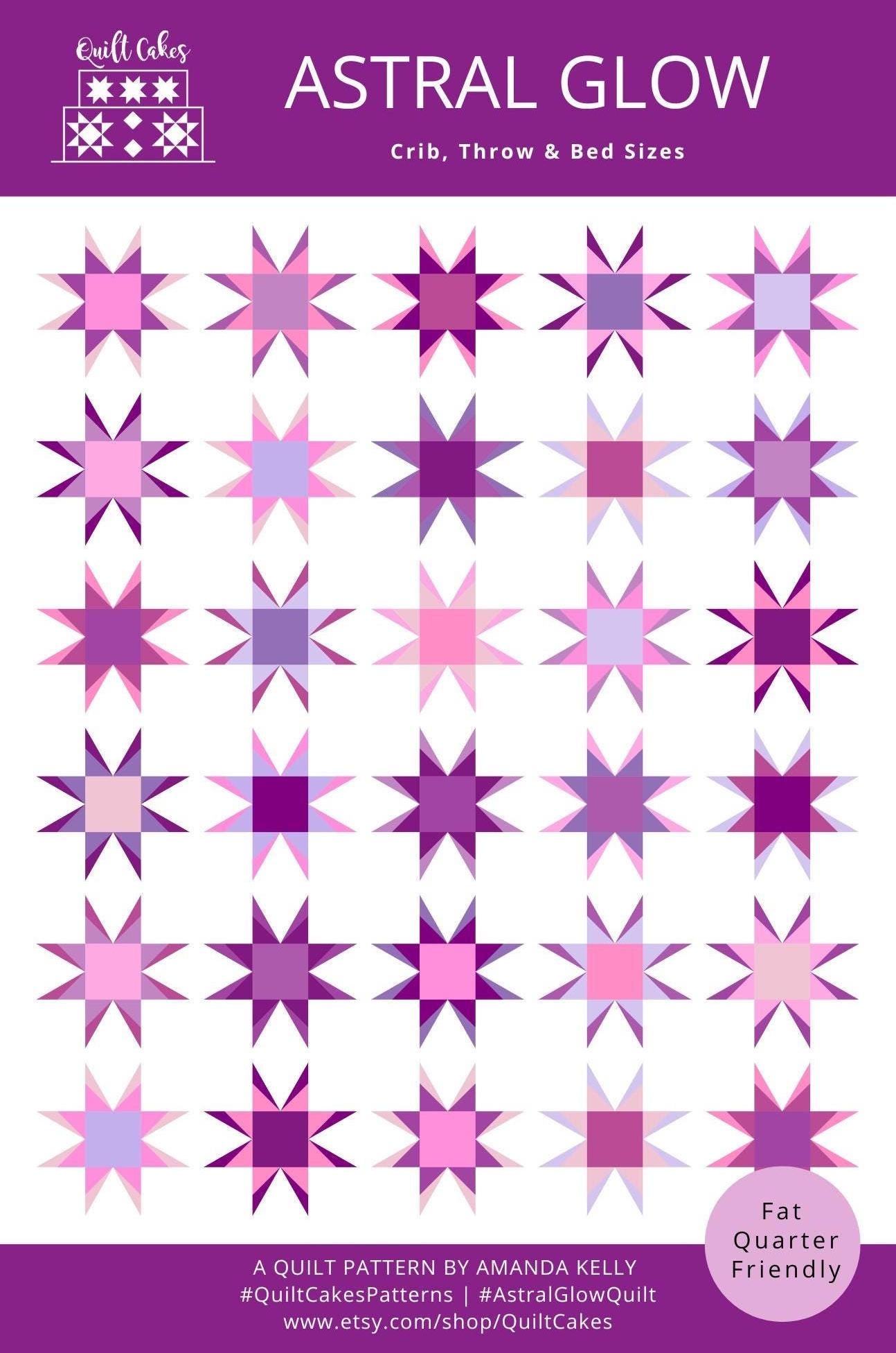 The Astral Glow Quilt offers six sizes (crib, small throw, large throw, XL throw, twin, and queen) that can be made with fat quarters, half yards, or yardage. Blocks finish at 12".