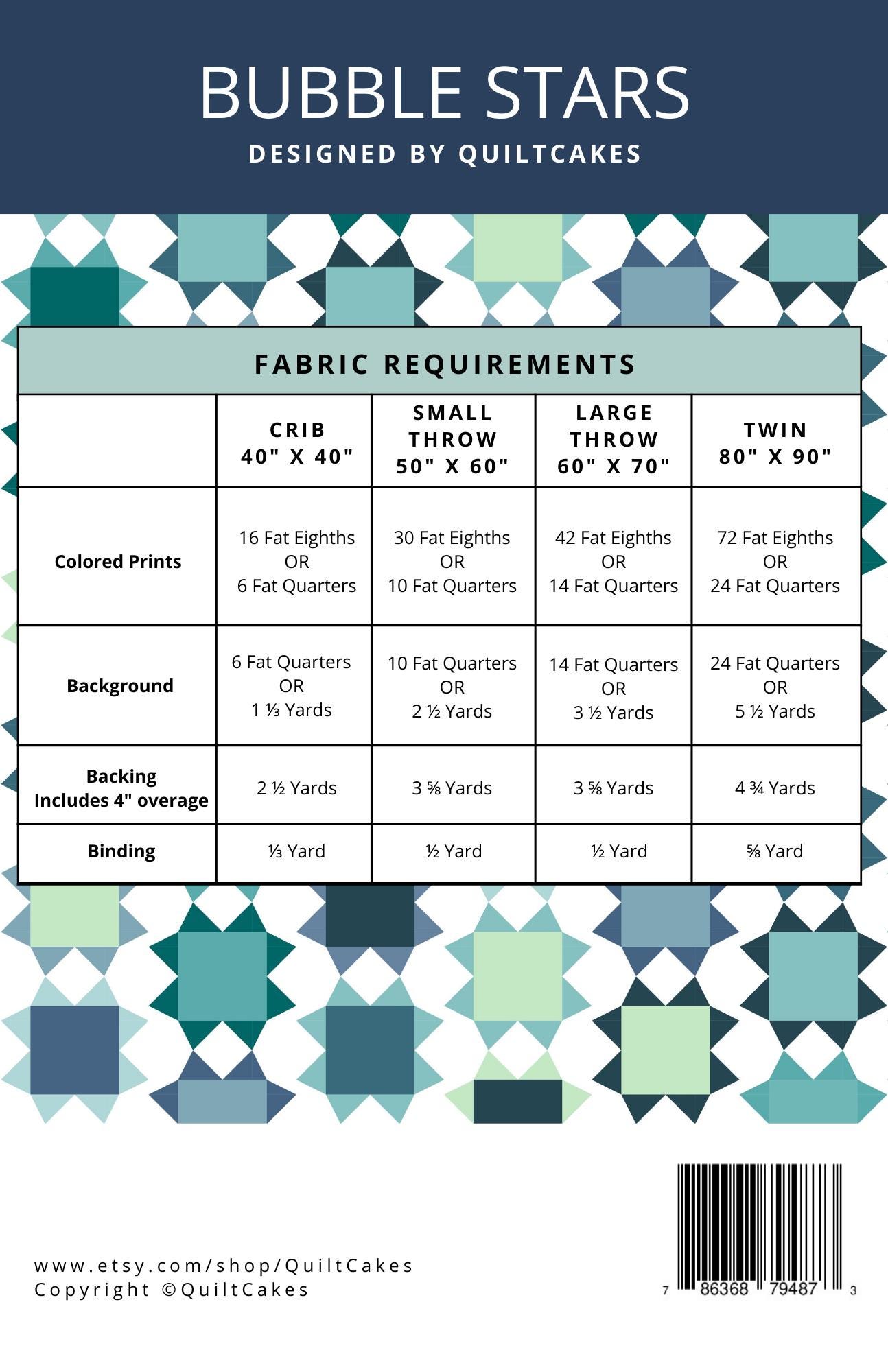 The Bubble Stars Quilt offers four sizes each (crib, small throw, large throw, and twin) that can be made with fat eighths, fat quarters or yardage. Blocks finish at 10".