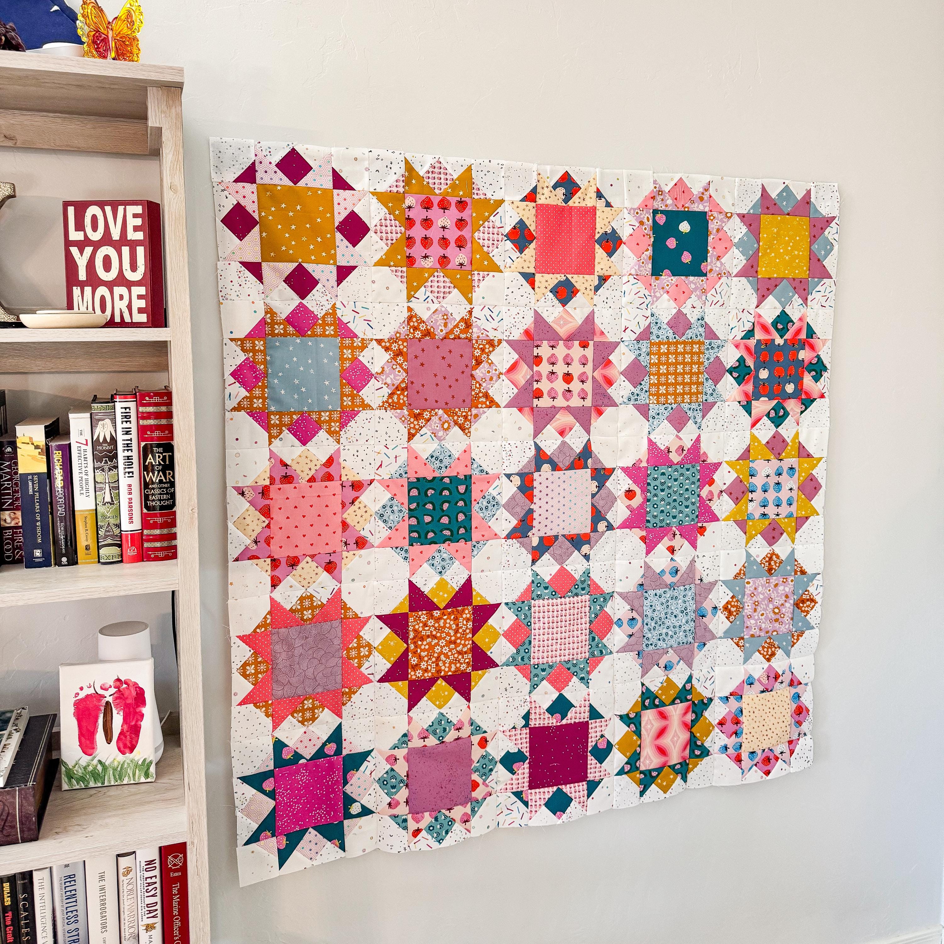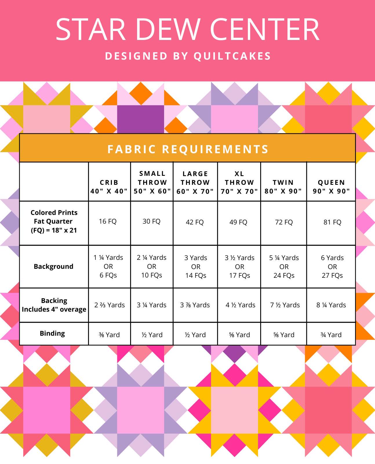 The Star Dew Center Quilt offers six sizes (crib, small throw, large throw, XL throw, twin, and queen) that can be made with fat quarters or yardage. Blocks finish at 10".