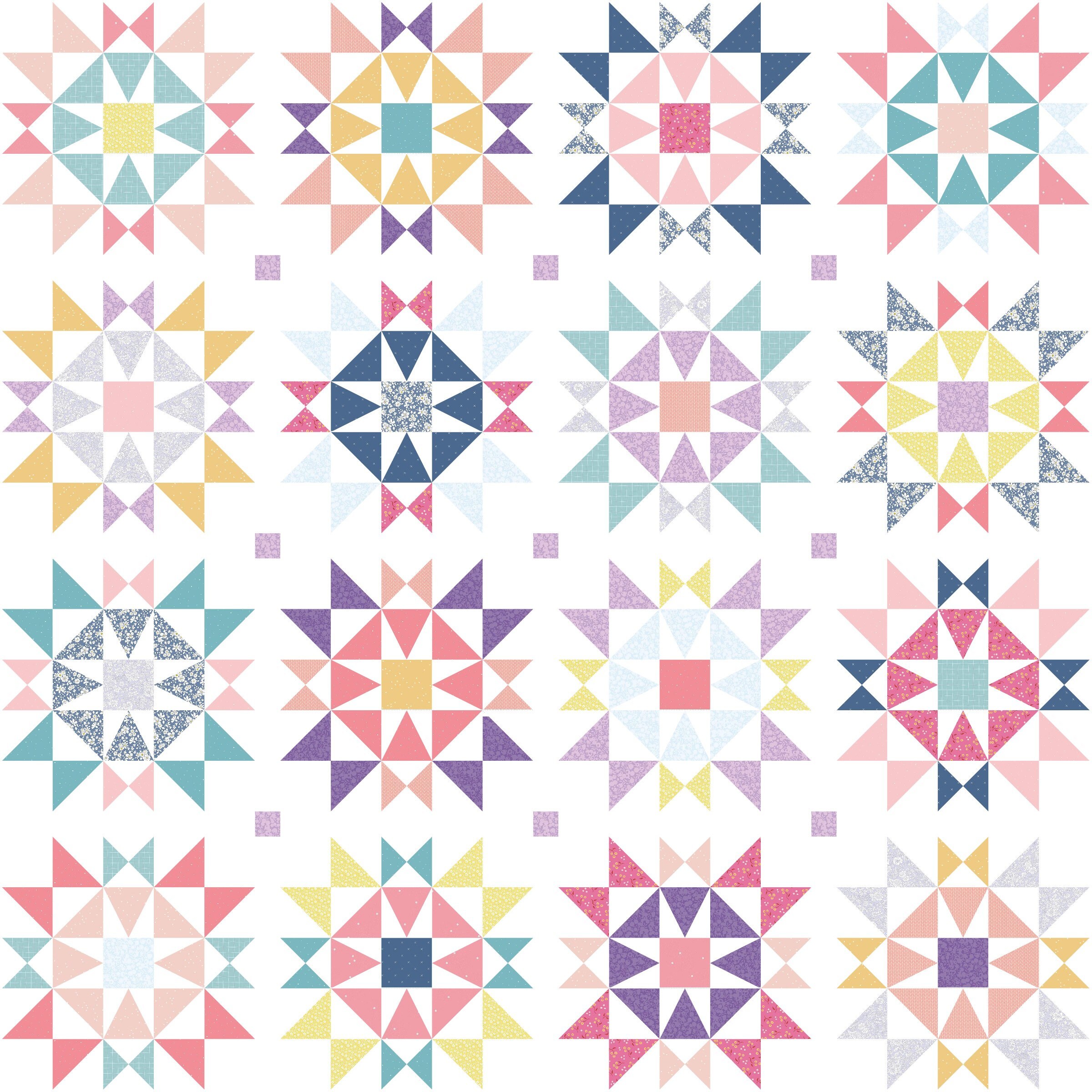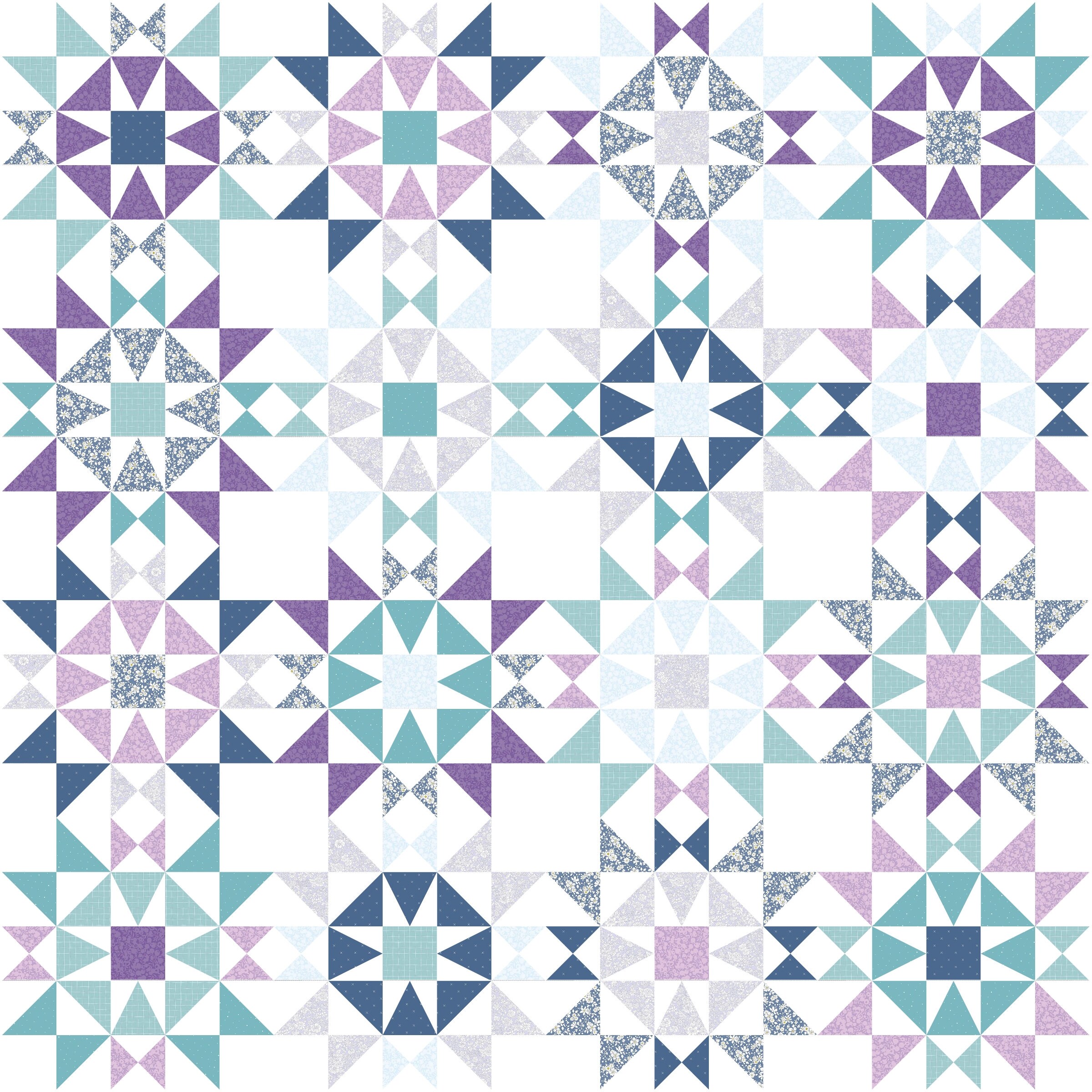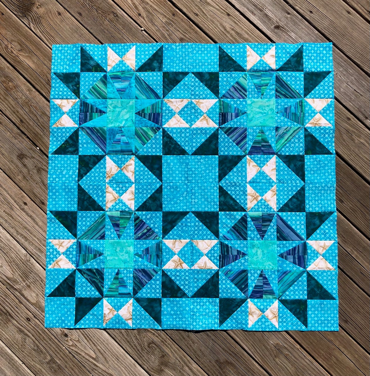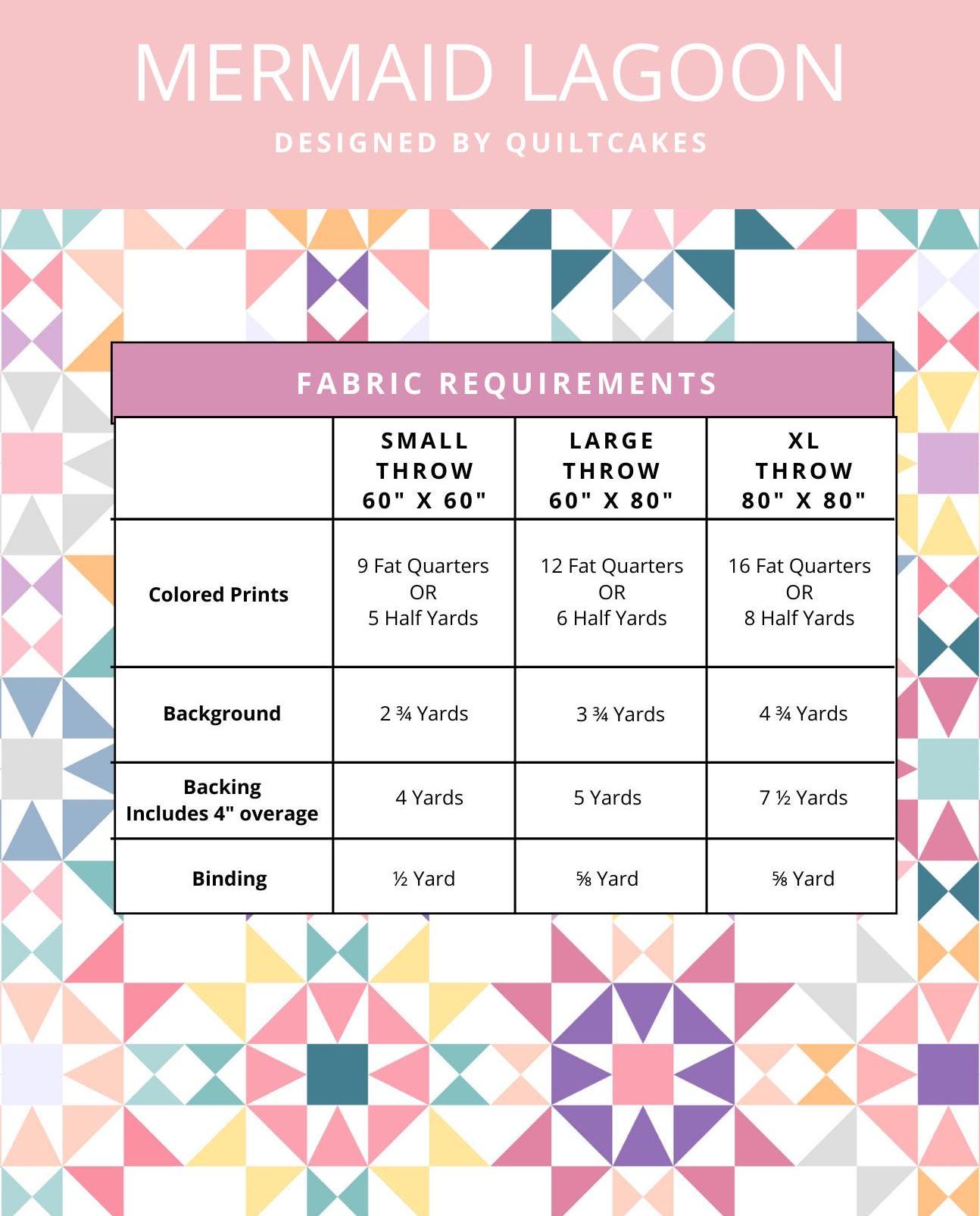The Mermaid Lagoon Quilt offers three sizes (small throw, large throw, and extra large throw) that can be made with a fat quarter or half yard bundle along with scraps. Blocks finish at 20".