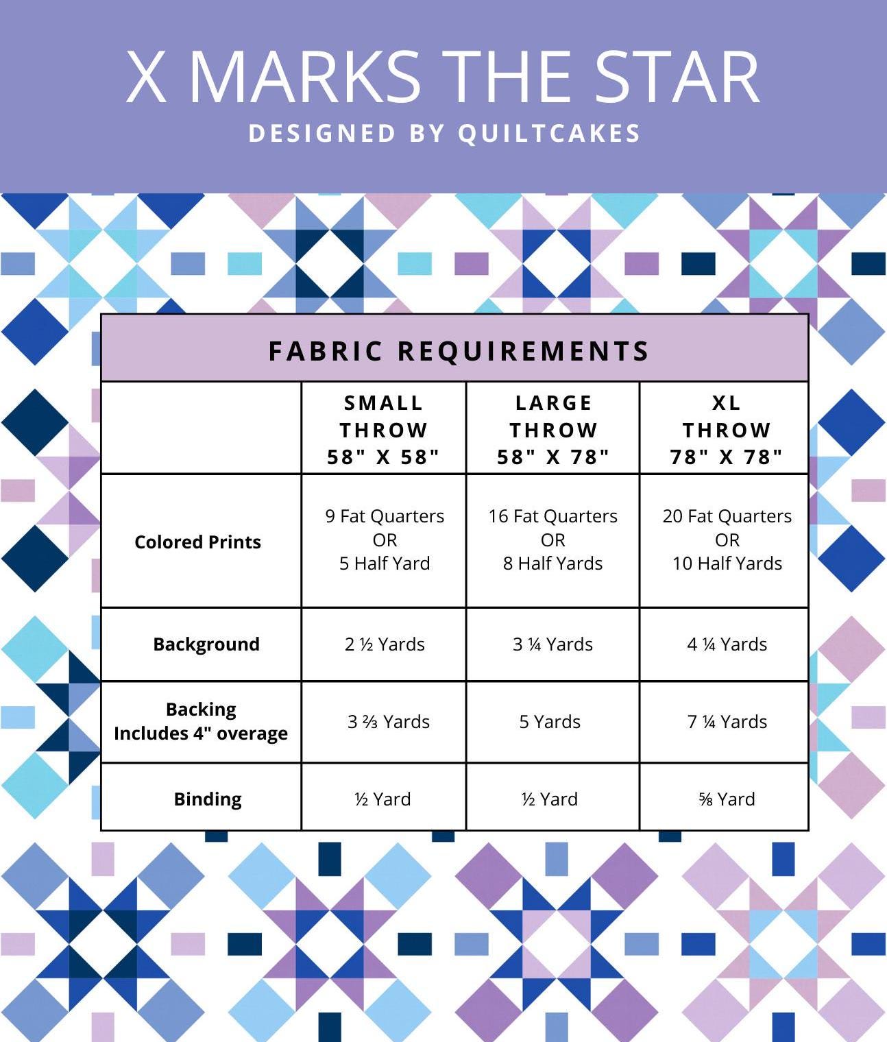 The X Marks the Star Quilt offers three sizes (small throw, large throw, and extra large throw) that can be made with a fat quarter or half yard bundle along with scraps. Blocks finish at 18".