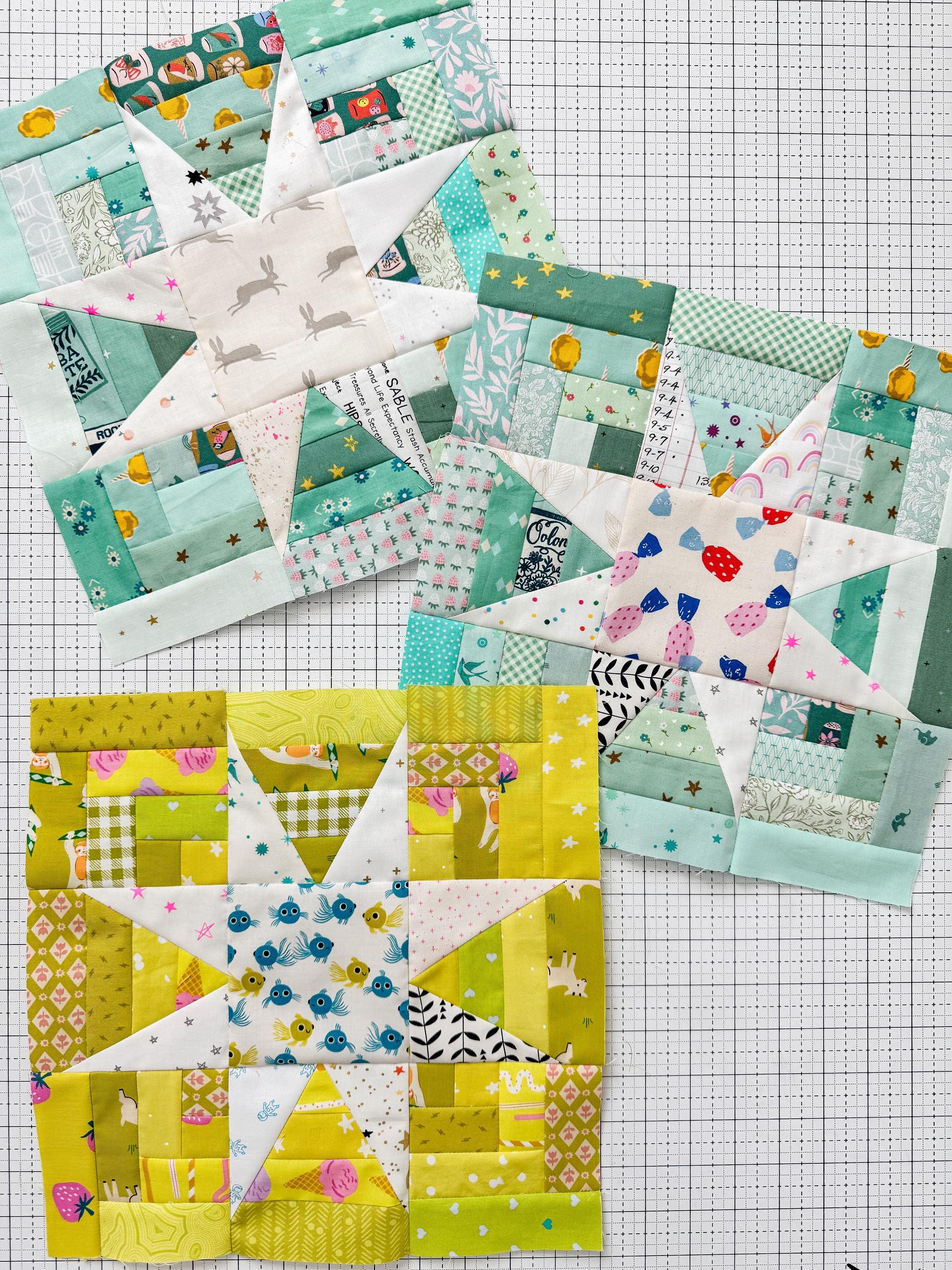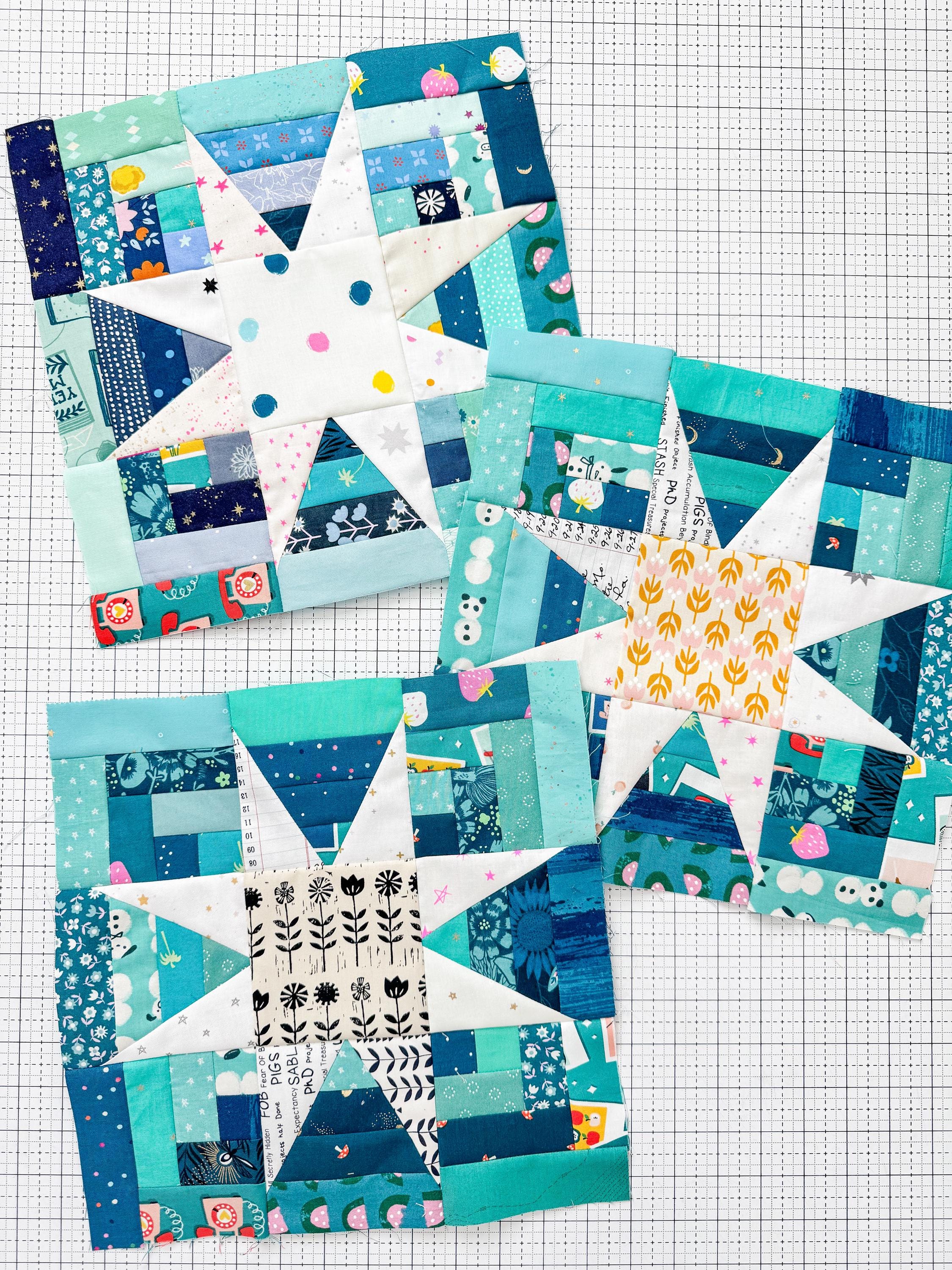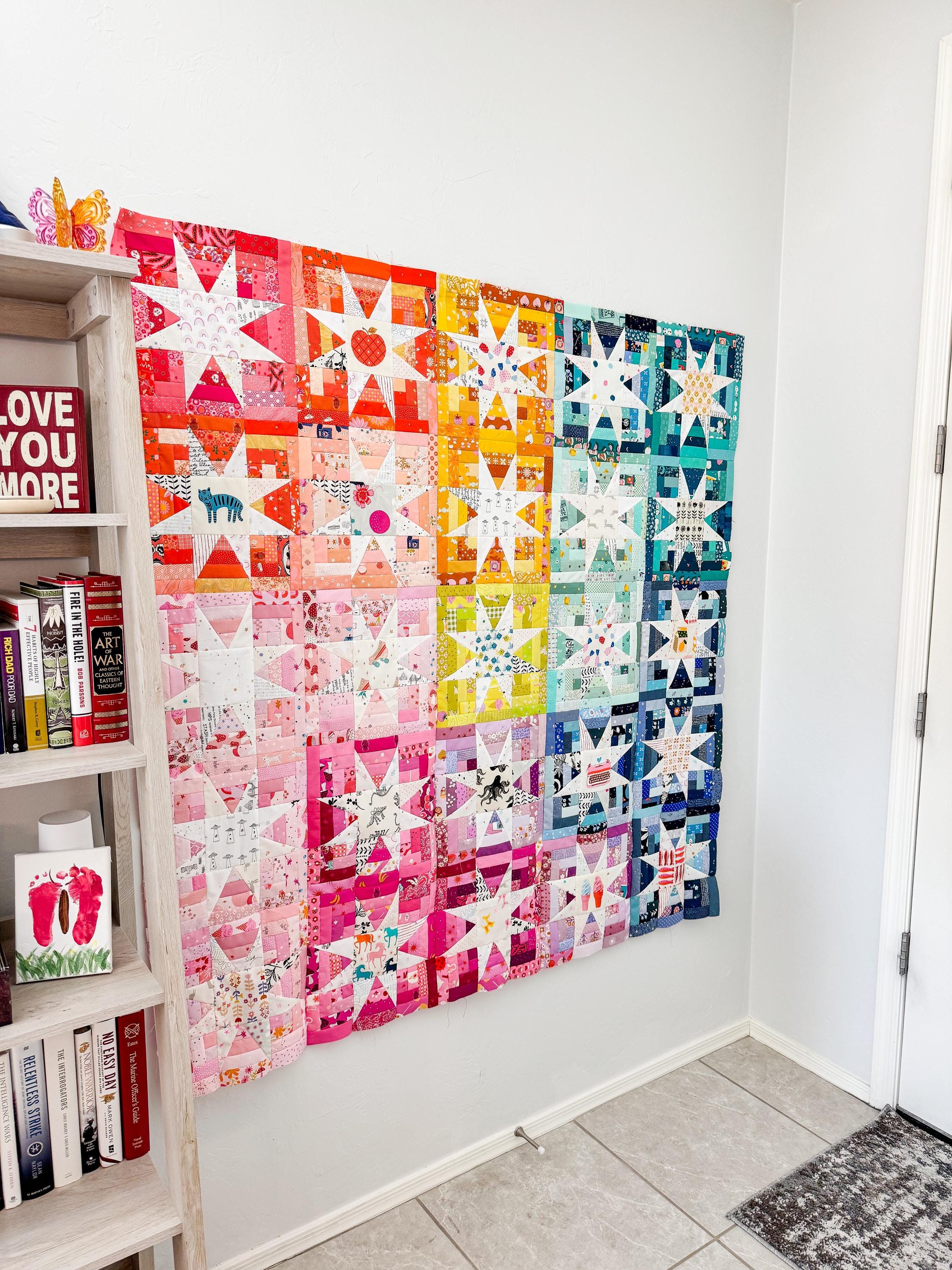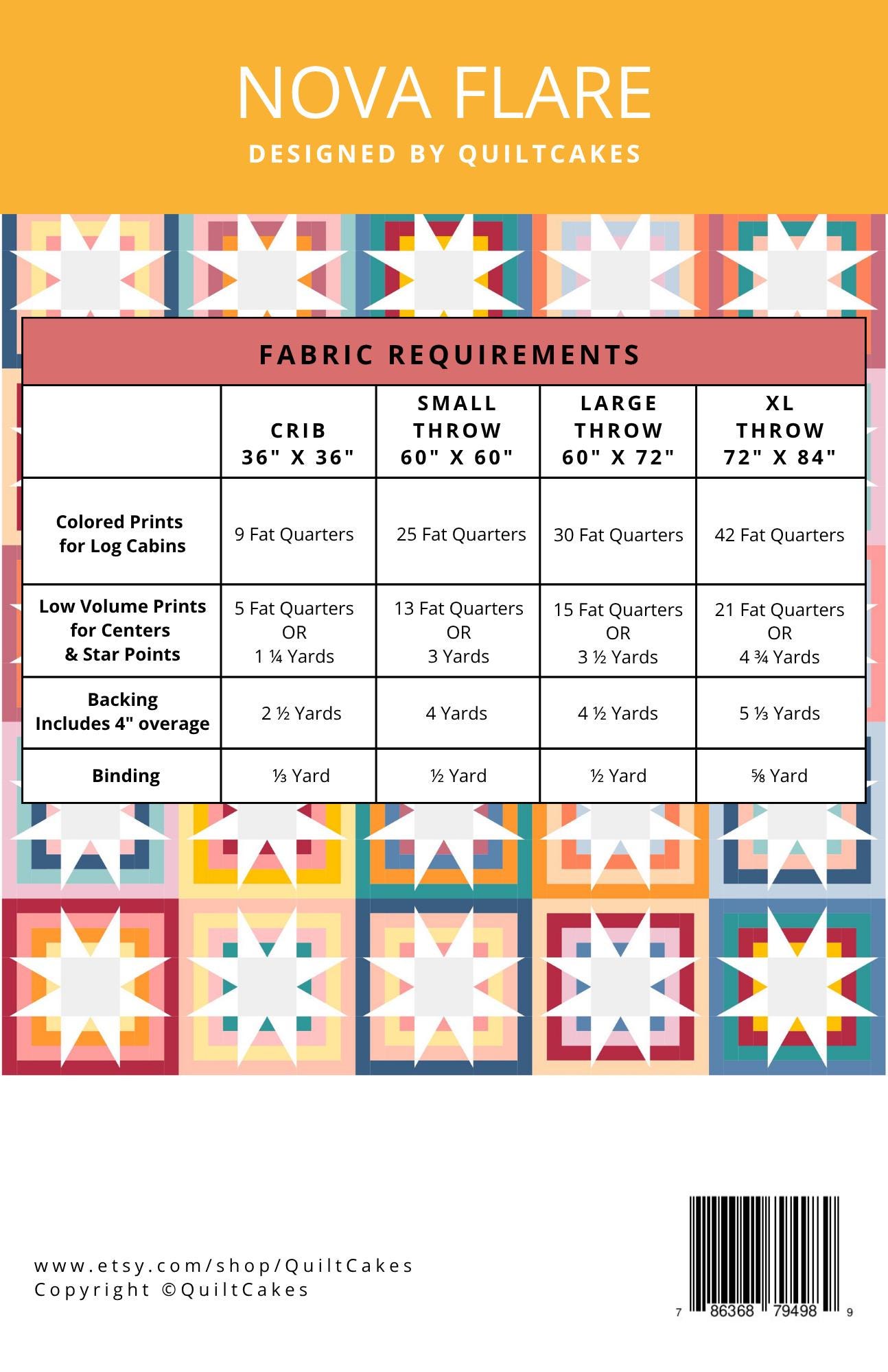 The Nova Flare Quilt offers four sizes (crib, small throw, large throw, XL throw) that can be made with fat quarters or yardage. Blocks finish at 12". The quilt blocks are traditionally pieced. If you enjoyed Astral Glow this quilt pattern is for you!