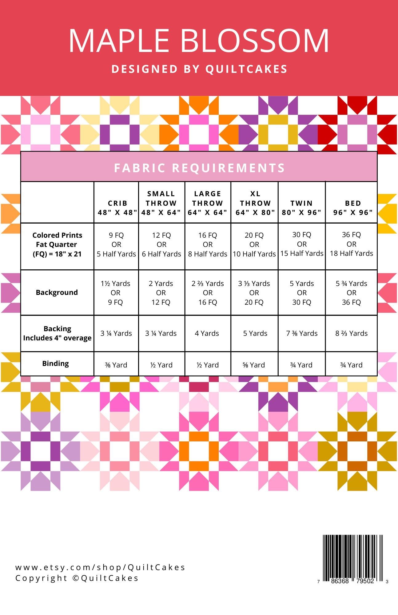Copyright QuiltCakes 2025. Pattern cannot be reproduced or sold, duplication is prohibited. Quilts made using the Maple Blossom pattern may be sold as long as credit is given.