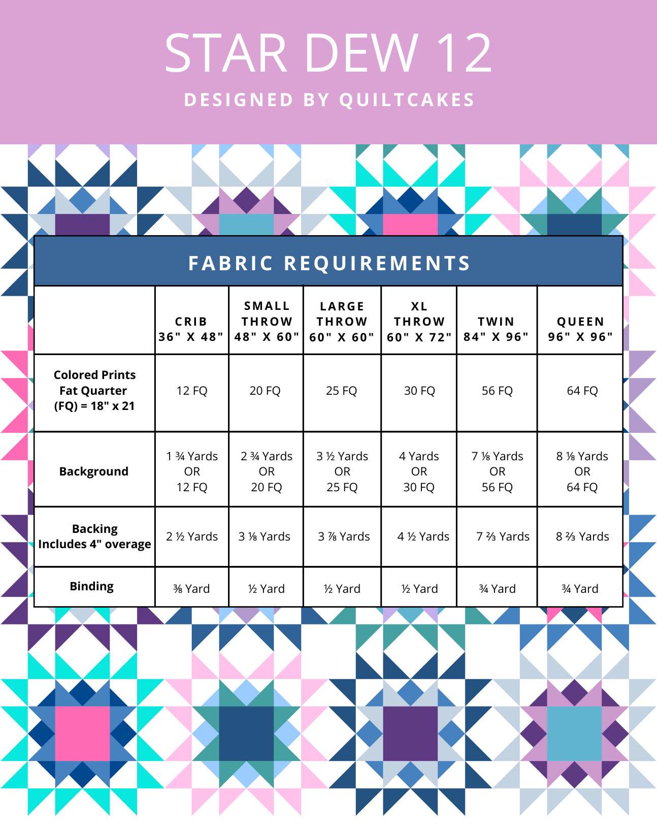 The Star Dew 12 Quilt offers six sizes (crib, small throw, large throw, XL throw, twin, and queen) that can be made with fat quarters or yardage. Blocks finish at 12".