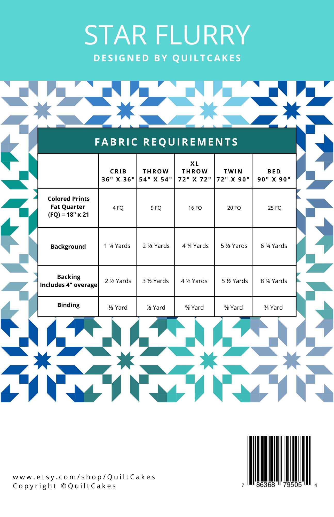 The Star Flurry Quilt offers five sizes (crib, throw, extra large throw, twin, and bed) that can be made with fat quarters. Blocks finish at 18".